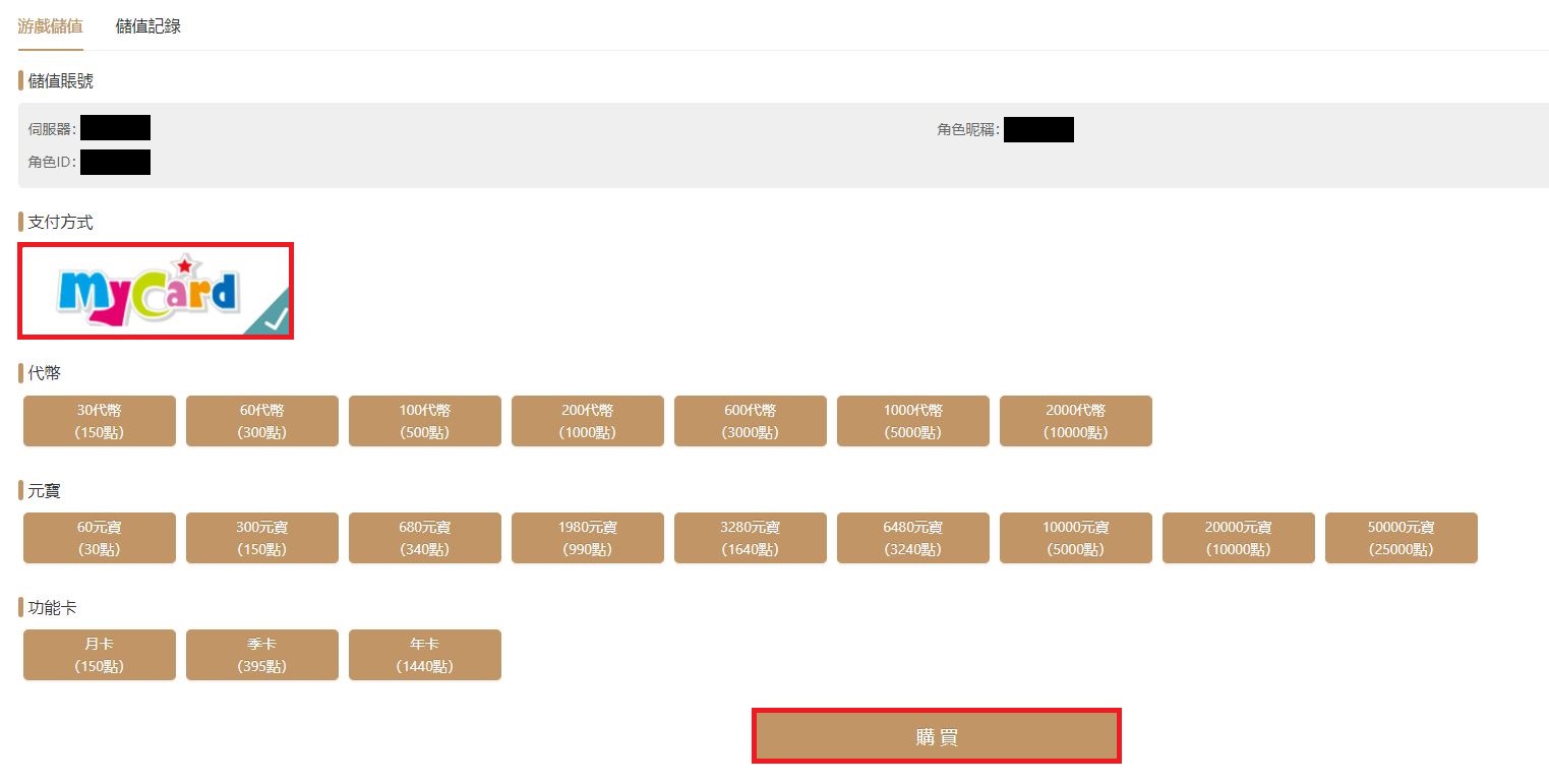 4. 支付方式選擇【MyCard】, 接著選擇欲購買的【商品】, 然後點擊【購買】.